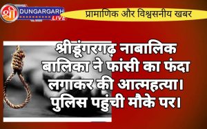 श्रीडूंगरगढ़ लाइव न्यूज़ 13 अक्टूबर 2024 थाना क्षेत्र के बिग्गा बास श्रीडूंगरगढ़ इलाके में एक नाबालिग बालिका द्वारा फांसी का...