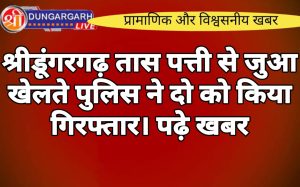 श्रीडूंगरगढ़ लाइव न्यूज़ 29 नवंबर 2024 थाना क्षेत्र के इलाके में ताश पत्ती पर जुआ खेलते पुलिस ने दो लोगों...