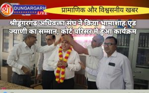 श्रीडूंगरगढ़ लाइव न्यूज़ 16 नवंबर 2024 श्रीडूंगरगढ़ अधिवक्ता संघ द्वारा कोर्ट परिसर मे सम्मान कार्यक्रम आयोजित कर भामाशाह अधिवक्ता बजरंग...
