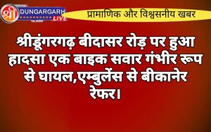 श्रीडूंगरगढ़ लाइव न्यूज़ 16 नवंबर 2024 श्रीडूंगरगढ़ में हादसे रुकने का नाम नहीं ले रहे हैं बीदासर रोड पर रिडी...