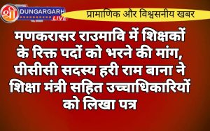 श्रीडूंगरगढ़ लाइव न्यूज़ 24 दिसंबर 2024 क्षेत्र के राउमावि मणकरासर में शिक्षकों के पदों के रिक्त होने की जानकारी स्थानीय...