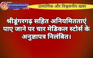 श्रीडूंगरगढ़ लाइव न्यूज़ 27 दिसंबर 2024 जांच के दौरान विभिन्न अनियमितताएं पाए जाने पर 4 मेडिकल स्टोर्स के अनुज्ञापत्र निलम्बित...