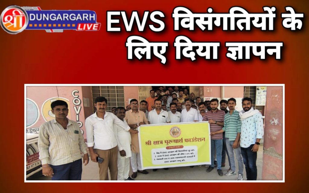 श्रीडूंगरगढ़ लाइव…08 मई 2023।श्री क्षत्रिय युवक संघ के आनुषंगिक संगठन श्री क्षात्र पुरुषार्थ फाउंडेशन के तत्वावधान में प्रदेश भर में EWS आरक्षण में विद्यमान विसंगतियों के सम्बंध में प्रधानमंत्री व मुख्यमंत्री के नाम ज्ञापन देने की मुहिम प्रारम्भ की गई है। इसके तहत पूरे प्रदेश में सैकड़ो स्थानों पर ज्ञापन दिए जा रहे है, इसी कड़ी में आज श्रीडूंगरगढ़ में उपखंड अधिकारी महोदय को ज्ञापन दिया गया।