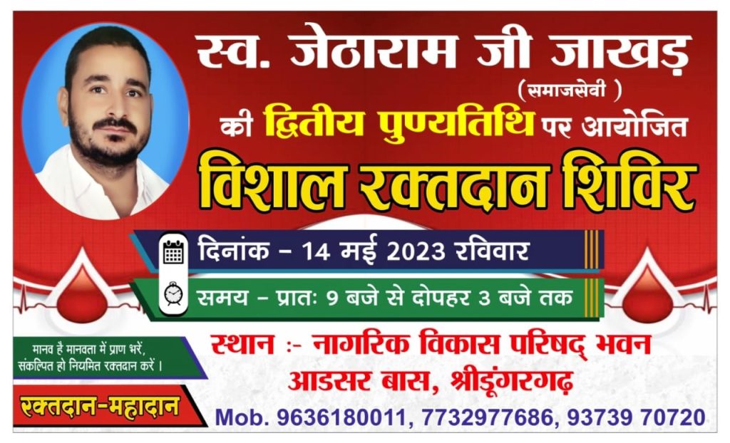 श्रीडूंगरगढ़ लाइव…12 मई 2023।जेठाराम जाखड़ चेरिटेबल ट्रस्ट द्वारा आगामी 14 मई को आयोजित होने वाले विशाल रक्तदान शिविर के पोस्टर का विमोचन शुक्रवार को कस्बे के महर्षि दयानंद छात्रावास में किया गया ओर रक्तदान शिविर में अधिकाधिक भागीदारी का आहान किया गया। ट्रस्ट से जुड़े मुकेश जाखड़ ने बताया कि समाजसेवी जेठाराम जाखड़ की द्वितीय पुण्यतिथि पर 14 मई को आडसर बास स्थित नागरिक विकास परिषद भवन में रक्तदान शिविर का आयोजन होगा। मास्टर प्रभुराम बाना ने बताया कि शिविर में अधिकाधिक रक्तदान के लिए कस्बे सहित ग्रामीण क्षेत्र में जनसपंर्क किया जा रहा है। इस दौरान लक्ष्मीनारायण भादू, राजकुमार डेलू, ओमप्रकाश भादू, पूर्व सरपंच श्रवणराम जाखड़, बिग्गा सरपंच जसवीर सारण, सोहनलाल गोदारा, कन्हैयालाल गोदारा, पूर्व प्रधान सूरजमल भुंवाल, रालोपा नेता विवेक माचरा, मोहनलाल भादू, सुशील सेरडिया, श्यामसुंदर आर्य, भाजपा नेता तोलाराम जाखड़, प्रभुराम बाना, क्रय विक्रय सहकारी समिति चैयरमैन तुलसीराम गोदारा, पूर्व सरपंच लक्ष्मणराम खिलेरी, गोपालराम गोदारा, रिड़ी सरपंच हेतराम जाखड़, खींयाराम गोदारा,यूथ कांग्रेस जिलाध्यक्ष हरिराम बाना, लक्ष्मण सियाग, भैराराम जाखड़, कैलाश सियाग, चांदराम चाहर सहित बड़ी संख्या में लोग उपस्थित रहे।