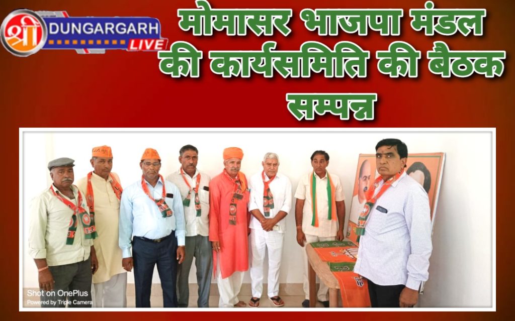 श्रीडूंगरगढ़ लाइव…25 मई 2023। भारतीय जनता पार्टी श्रीडूंगरगढ़ कार्यालय में आज मोमासर मण्डल कार्यसमिति की बैठक सम्पन्न हुई। पण्डित दीनदयाल उपाध्याय, श्यामा प्रसाद मुखर्जी के साथ भारत माता के छायाचित्र पर दीप प्रज्जवलित कर बैठक की शुरुआत की गई। पूर्व जिलाध्यक्ष ताराचंद सारस्वत