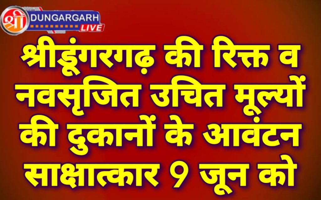 श्रीडूंगरगढ़ लाइव 29 मई 2023। श्रीडूंगरगढ़ के ग्रामीण व शहरी क्षेत्रों में रिक्त एवं नवसृजित उचित मूल्य दुकानों के आवंटन हेतु साक्षात्कार 9 जून को होंगे।