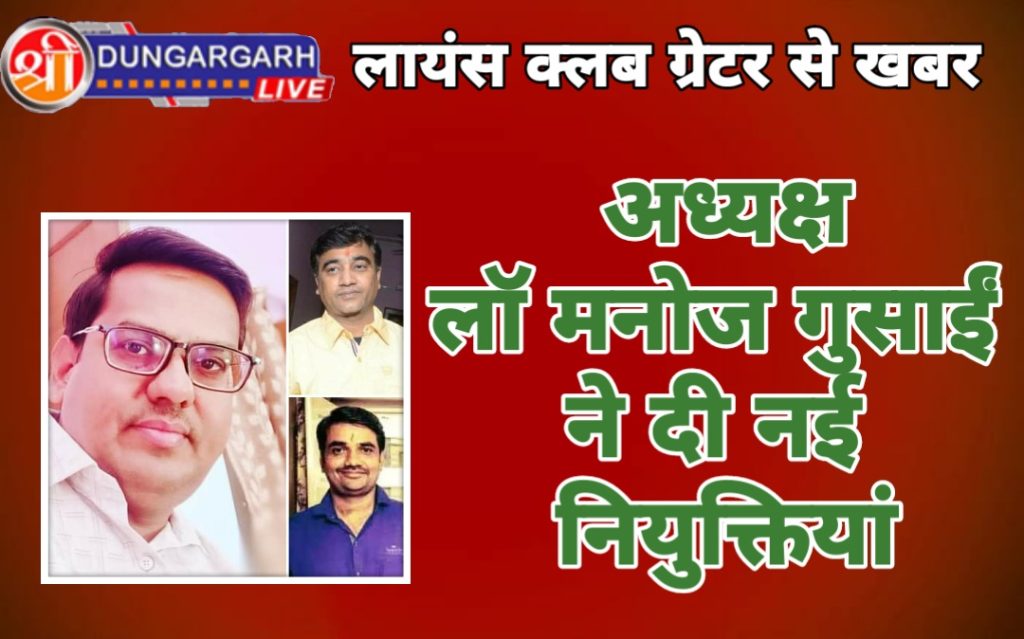 श्रीडूंगरगढ़ लाइव 02 जून 2023। श्रीडूंगरगढ़ की सेवाभावी संस्था लायंस क्लब ग्रेटर कस्बे ही नही पूरे क्षेत्र में अपनी सामाजिक, सांस्कृतिक गतिविधियों को संचालित करती रहती है। लायंस क्लब श्री डूंगरगढ़ ग्रेटर द्वारा कल 1 जून को लॉयन रवि प्रकाश शर्मा, जोन चेयरपर्सन 2 के आदेशानुसार श्री डूंगरगढ़ लायंस क्लब ग्रेटर के नव निर्वाचित अध्यक्ष लॉयन मनोज कुमार गुसाई ने सत्र 2023-24 वर्ष की कार्यकारिणी का विस्तार करते हुए लॉयन कन्हैया लाल सारस्वत को मेंबरशिप कमेटी का चेयरपर्सन, लॉयन महेंद्र कुमार जैन को क्लब एडमिनिस्ट्रेटर चेयरपर्सन एवं लॉयन विकास कुमार सोनी को मार्केटिंग चेयरपर्सन नियुक्त किया। संगठन के सभी सदस्यों एवं मित्रो ने नवनियुक्त सभी पदाधिकारियों को बधाइयां एवं शुभकामनाएं दी।