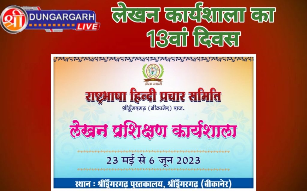 श्रीडूंगरगढ़ लाइव 04 2023। राष्ट्र भाषा हिन्दी प्रचार समिति द्वारा आयोजित लेखन प्रशिक्षण कार्यशाला में नव लेखकों को सम्बोधित करते हुए कृषि अधिकारी कन्हैयालाल सारस्वत ने कहा कि वर्तमान युग, अनेक प्रकार की विडंबनाओं का युग है। ऐसे विकट समय में सच की ज्योति जलाने का कार्य केवल लेखक कर सकते हैं। राजनीति ने तो सर्वत्र झूठ और अविश्वसनीयता का प्रसार किया है। पग पग पर हमारे सामाजिक और नैतिक मूल्य तार तार होते रहे हैं। लेखक मूलतः मानवताधर्मी होते हैं, उनसे समाज को बोध प्राप्त होता है। लेखन प्रशिक्षण कार्यशाला जैसा प्रयोग अंधेरे में रोशनी की उम्मीद है।