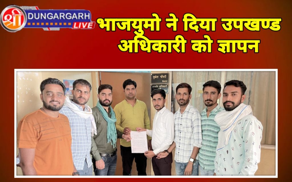 श्रीडूंगरगढ़ लाइव 07 जून 2023। भाजयुमो पदाधिकारियों और सदस्यों ने उपखण्ड अधिकारी को आज वन विभाग भूमि पर हुई अवैध कटाई पर ज्ञापन देते हुए उनसे कड़ी कार्यवाही करने की मांग की।