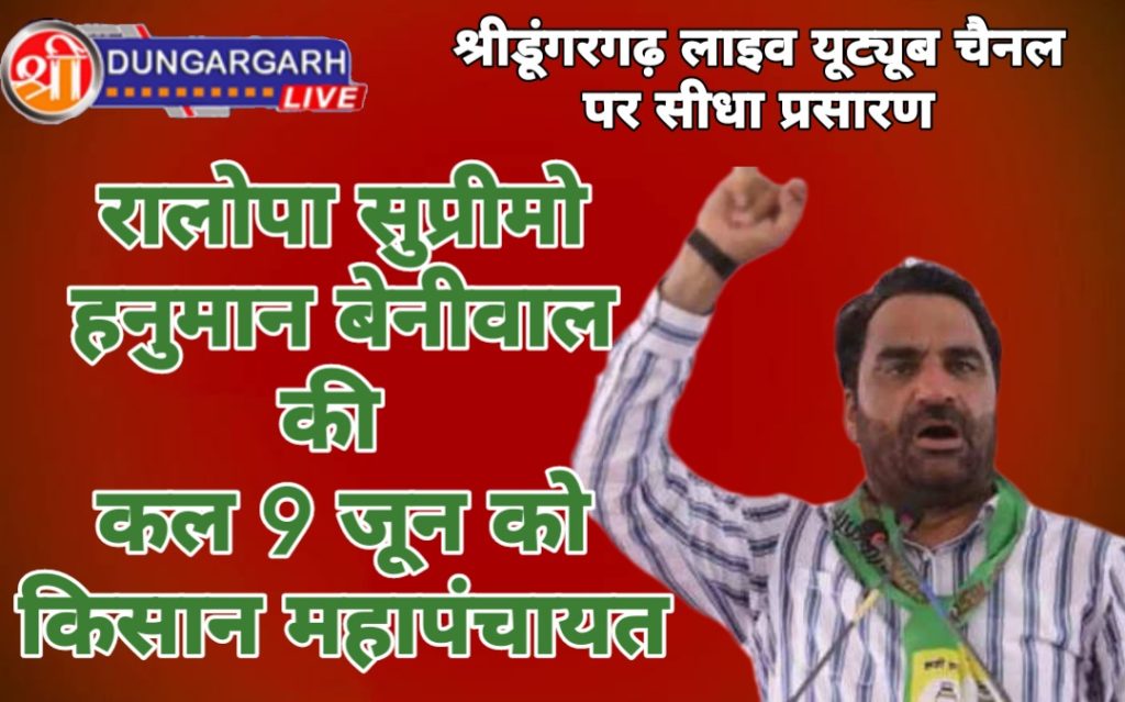 श्रीडूंगरगढ़ लाइव 08 जून 2023। शुक्रवार को राष्ट्रीय लोकतांत्रिक पार्टी द्वारा बीकानेर जिले के श्रीडूंगरगढ़ मुख्यालय पर किसान महापंचायत का आयोजन सुबह 11 बजे से किया जायेगा। आरएलपी कार्यालय से जारी प्रेस बयानों के अनुसार पार्टी सुप्रीमों व नागौर सांसद हनुमान बेनीवाल इस कार्यक्रम को संबोधित करेंगे, प्रदेश के किसानों की सम्पूर्ण कर्जमाफी, स्टेट हाइवे को टोल फ्री करने, भ्रष्टाचार मुक्त राजस्थान, फसली बीमा का समय पर पूरा क्लेम दिलवाने, सरकारी महकमों में रिक्त पदों को पारदर्शी भर्ती प्रक्रियाओ से भरने, सभी बेरोजगारो को समय पर भत्ता देने, लंबे समय से डिमांड भरे हुए कृषि कनेक्शन जारी करने, निर्बाध विद्युत आपूर्ति, नहरी पानी से सिंचित क्षेत्र को बढ़ाने, बढ़ते अपराधों पर रोकथाम के लिए प्रभावी कानूनी कार्यवाही करवाने, पेट्रोल -डीजल की कीमतों को कम करवाने सहित श्रीडूंगरगढ़ क्षेत्र की भी पेयजल, सड़क सहित स्थानीय सार्वजनिक समस्याओं के त्वरित समाधान की मांग को लेकर इस किसान महापंचायत का आयोजन किया जा रहा है, कार्यक्रम में आरएलपी से भोपालगढ़ विधायक पुखराज गर्ग, मेड़ता विधायक इंदिरा देवी बावरी व खींवसर विधायक नारायण बेनीवाल सहित प्रदेश भर के आरएलपी नेता इस सभा को संबोधित करेंगे, आरएलपी नेता दानाराम गिंटाला व डॉक्टर विवेक माचरा ने बताया की आयोजन की तैयारियां पूरी की जा चुकी है और बीकानेर जिले के सभी क्षेत्रों से किसान और युवा इस महापंचायत में भाग लेंगे।