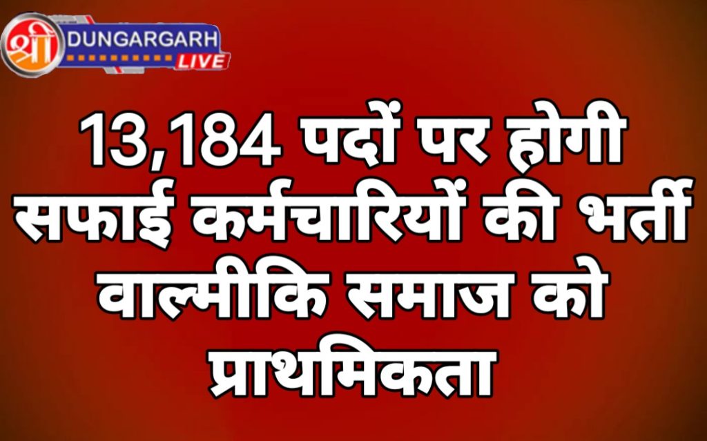 श्रीडूंगरगढ़ लाइव 10 जून 2023। राजस्थान में सफाई कर्मचारियों के 13 हजार 184 पदों पर संशोधित भर्ती विज्ञप्ति जारी की गई है। जिसमें वाल्मीकि समाज को प्राथमिकता दी गई है। स्वायत्त शासन विभाग संशोधित भर्ती विज्ञप्ति जारी कर दी है। राजस्थान के 176 नगरीय निकायों में होने वाली इस भर्ती चयन में वाल्मीकि समाज को प्राथमिकता देने का जिक्र किया गया है। सफाई कर्मचारियों की सबसे ज्यादा 3 हजार 670 पद पर भर्ती ग्रेटर नगर निगम में होगी। जल्द 12 हजार 328 पदों पर एक भर्ती विज्ञप्ति और जारी की जाएगी। राज्य सरकार की ओर से प्रदेश के विभिन्न नगरीय निकायों में सफाई कर्मचारियों के 30 हजार पदों पर भर्ती की घोषणा की गई थी। इनमें से फिलहाल 13 हजार 184 रिक्त पदों पर भर्ती विज्ञप्ति जारी की गई है।