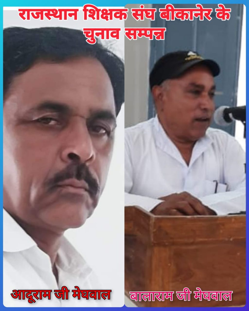 श्रीडूंगरगढ़ लाइव 10 जुलाई 2023। राजस्थान शिक्षक संघ (शेखावत) के बीकानेर जिलाध्यक्ष बने आदूराम मेघवाल। कल 9 जून को देर शाम राजस्थान शिक्षक संघ (शेखावत) के चुनाव हुए सम्पन्न। श्रीडूंगरगढ़ झंझेऊ के प्रधानाध्यापक गुरुदेव आदूराम मेघवाल निर्विरोध अध्यक्ष चुने गए। सभा अध्यक्ष के पद पर श्रीडूंगरगढ़ के वरिष्ठ अध्यापक बालाराम मेघवाल की नियुक्ति हुई।