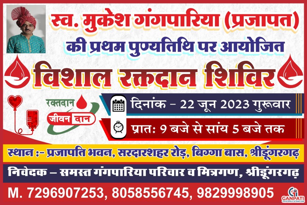 श्रीडूंगरगढ़ लाइव 18 जून 2023।बीकानेर जिले में श्रीडूंगरगढ़ क्षेत्र सबसे ज्यादा रक्तदान करने और शिविर आयोजित करने वाला क्षेत्र है। इसी कड़ी में कस्बे के युवा समाजसेवी सेवादार मुकेश गंगपारिया (प्रजापत) की प्रथम पुण्यतिथि पर 22 जून को युवा करेंगे रक्तदान।