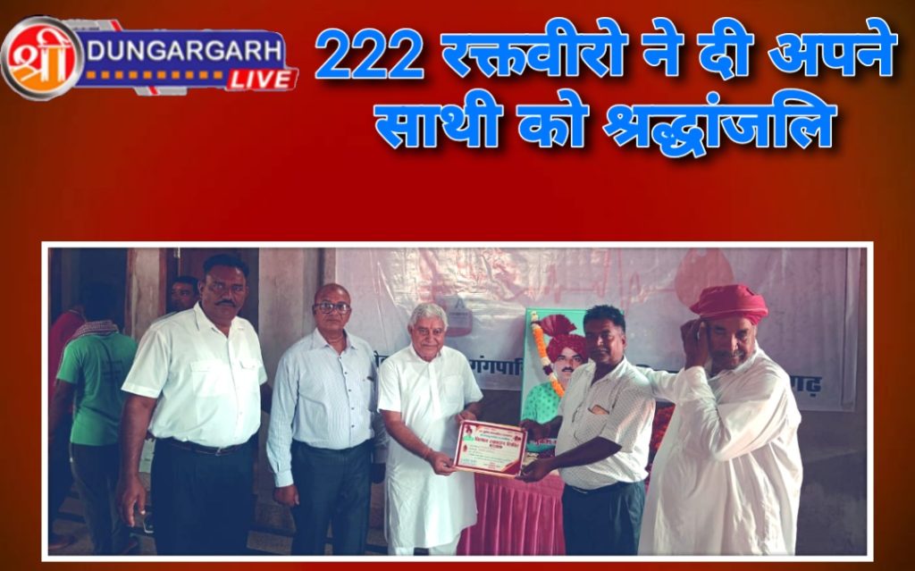श्रीडूंगरगढ़ लाइव 22 जून 2023। श्रीडूंगरगढ़ में आज सक्रिय सेवादार और युवा साथी स्व. मुकेश गंगपारिया को प्रथम पुण्यतिथि पर उसके साथियों ने रक्तदान करके श्रद्धांजलि अर्पित की।