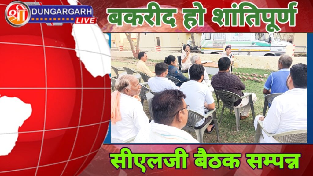 श्रीडूंगरगढ़ लाइव 27 जून 2023। 29 जून को बकरीद का त्यौहार शांति,सद्भाव और सौहार्द्रपूर्ण मनाया जाए। शहर अपनी पुरानी कड़वी यादों से बाहर निकलकर भाईचारे की मिसाल बने… ये उद्गार आज सीएलजी समिति की बैठक में वृताधिकारी रामेश्वरलाल सहारण ने व्यक्त किये।