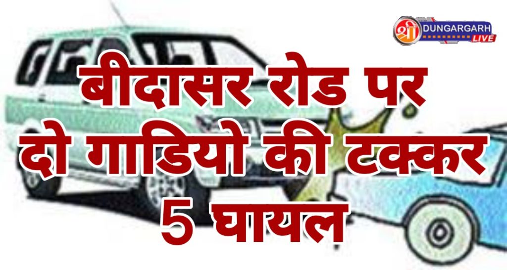 श्रीडूंगरगढ़ लाइव 28 जून 2023। कल ही बीदासर रोड पर हादसा हुआ था। आज फिर बीदासर रोड पर बड़ी दुर्घटना की खबर आ रही है। एक थार गाड़ी और अल्टो कार में टक्कर होने से 5 लोग घायल हो गए। दुर्घटना की जानकारी मिलते ही आपणो गांव सेवा समिति की एंबुलेंस मौके पर पहुंची और घायलों को श्रीडूंगरगढ़ सामुदायिक स्वास्थ्य केन्द्र लाया गया। घायलों में सुजानगढ़ निवासी विमला पत्नि अमृतलाल सोनी 58 साल, देव पुत्र सुनील 10 साल, सोनू पत्नि नारायण 29 ,विक्रम पुत्र अमृतलाल सोनी 28, और मामराज पुत्र खेताराम 30 समंदसर निवासी है। घायलों का प्राथमिक इलाज चल रहा है। एक घायल को बीकानेर रेफर किया गया है। घटना की जानकारी मिलने पर श्री डूंगरगढ़ पुलिस भी अस्पताल पहुँची हैं और मामले की जांच कर रही है।