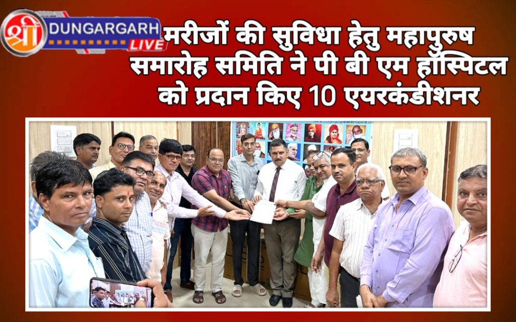 श्रीडूंगरगढ़ लाइव 11 जुलाई 2023।महापुरुष समारोह समिति, श्रीडूंगरगढ़ द्वारा पी बी एम हॉस्पिटल बीकानेर प्रशासन के विशेष आग्रह पर 10 एयर कंडीशनर मय स्टेबलाइजर मरीजों की सुविधा हेतु प्रदान किए गए । पी बी एम हॉस्पिटल परिसर में इन उपकरणों का एक गरिमामय लोकार्पण समारोह आयोजित किया गया। संस्था के अध्यक्ष एवं कस्बे के प्रमुख सामाजिक कार्यकर्ता श्रीगोपाल राठी ने समारोह की अध्यक्षता करते हुए अपने उदबोधन में कहा कि परोपकार से बढ़ कर कोई पुण्य कार्य नही है। नर सेवा ही नारायण सेवा है का भाव जीवन का अंतिम और एक मात्र लक्ष्य होना चाहिए। प्रत्येक व्यक्ति अर्जन के साथ विसर्जन के भाव को चरितार्थ करते हुए सामाजिक सरोकारों के निर्वहन की दिशा में आगे बढ़ता है। मुख्य अतिथि पी बी एम हॉस्पिटल के अधीक्षक डॉ. पी के सैनी ने संबोधित करते हुए कहा कि समिति ने ये जो उपकरण अस्पताल को भेंट किए है वे जरूरतमंद रोगियों के स्वास्थ्य में समुचित सुधार और उपचार की दिशा में एक सकारात्मक और रचनात्मक प्रयास है। विशिष्ठ अतिथि सरदार पटेल राजकीय मेडिकल कॉलेज के प्राचार्य डॉ. गुंजन सोनी ने समिति के अध्यक्ष श्रीगोपाल राठी, मंत्री सुशील सेरडिया एवं दानदाताओं का इस अनुपम सहयोग के लिए आभार जताते हुए समिति के जन कल्याणकारी कार्यो की प्रशंसा की। अतिरिक्त प्राचार्य डॉ. नौरंग महावर ने अपने संबोधन में श्रीडूंगरगढ़ को भामाशाहो और सामाजिक कार्यकर्ताओं की भूमि बताते हुए कहा कि रक्तदान शिविरों के आयोजन में भी श्री डूंगरगढ़ सभी के लिए प्रेरणा स्त्रोत है। अस्पताल के पूर्व अधीक्षक श्री परमेन्द्र सिरोही ने समिति द्वारा उपलब्ध करवाए गए इन उपकरणों की उपयोगिता और महत्त्व के बारे में जानकारी देते हुए बताया कि ये उपकरण अस्पताल के लिए अति आवश्यक थे । इस अवसर पर डॉक्टर संजीव बूरी ने भी अपने उदबोधन में समिति का आभार जताया । अस्पताल के वरिष्ठ लेखाकार विजय शंकर,लेखाकार दीन दयाल खड़गावत, माहेश्वरी धर्मशाला के प्रबंधक श्री त्रिलोक चंद गहलोत,इंजीनियर अरुंधति सांखला ने भी समारोह में शिरकत की। समिति के विजय महर्षि ने बताया कि श्रीलाधुराम जी राठी परिवार ने चार, श्री सत्य नारायण जी बिहानी, श्री किशन लाल राधेश्याम जी तोषनीवाल, श्री सोहनलाल शुशील कुमार तोषनीवाल, श्री फूसराज श्यामसुंदर जी चांडक, श्री मूलचंद राधेश्याम बिहानी,श्री सूरजमल दिनेश कुमार लाहोटी प्रत्येक ने एक एक एयर कंडीशनर में अपना आर्थिक सौजन्य उपलब्ध करवाया। इस अवसर पर दानदाता परिवार से श्री श्याम सुंदर चांडक,श्री रमेश कुमार बिहानी,श्री सीताराम राठी उपस्थित थे। समारोह में समिति के ओमप्रकाश कलानी, निर्मल कुमार पुगलिया, जगदीश प्रसाद भांबू एडवोकेट, ललित कुमार बाहेती, सुरे