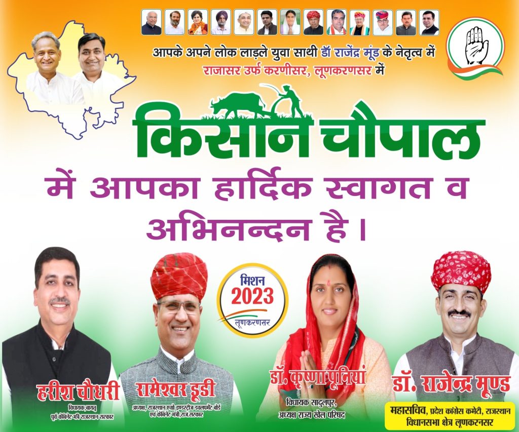 श्रीडूंगरगढ़ लाइव 15 जुलाई 2023। पीसीसी महासचिव डॉ राजेन्द्र मूंड की किसान चौपाल कल 16 जुलाई को सुबह 11:00 बजे राजासर (करनीसर) में होगी।