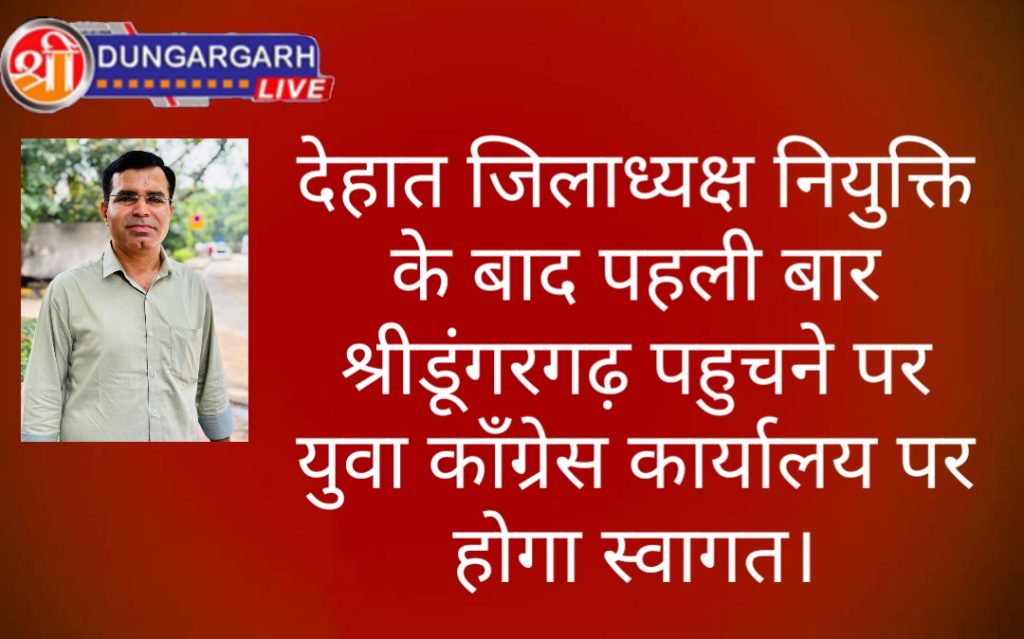 श्रीडूंगरगढ़ जिला कांग्रेस कमेटी (देहात) बीकानेर के नव नियुक्त जिलाध्यक्ष बिशनाराम सियाग आज सुबह 7 बजे जयपुर से रवाना होकर 1 बजे श्रीडूंगरगढ़ युवा कॉंग्रेस कार्यालय पहुंचेगे। पूर्व जिलाध्यक्ष हरिराम बाना ने जानकारी देते हुवे बताया कि बिशनाराम सियाग जिलाध्यक्ष देहात कॉंग्रेस बनने पर प्रथम बार श्रीडूंगरगढ़ पधार रहे है उनका भव्य स्वागत होगा। नवनियुक्त जिलाध्यक्ष श्रीडूंगरगढ़ रवाना होकर बीकानेर जायेगे