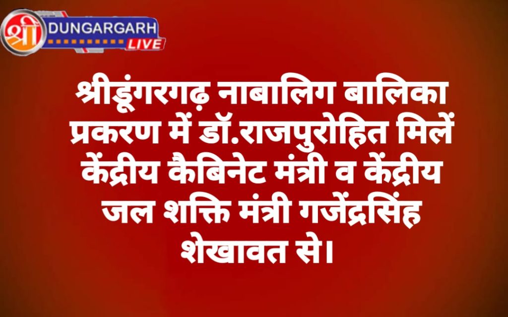 श्रीडूंगरगढ़ नाबालिग बालिका एंव शिक्षिका के प्रकरण में दोनों को पुलिस द्वारा दस्तयाब करने के 5-6दिन पश्चात अनेकों धारा में 53 नामजद एंव 300 अन्य व्यक्तियों पर लोकतांत्रिक तरीके से शान्तिपूर्वक आंदोलन करने वाले निर्दोष युवाओं,व्यापारियों,महिलाओं एंव नाबालिग के परिजनों पर जिस प्रकार एफआईआर की गयी उससे क्षेत्र में आक्रोश फैला हुआ है।कल हाईकोर्ट ने गिरफ़्तारी पर स्टे दे दिया है परन्तु मामला अभी तक सरकार द्वारा वापिस नहीं लिया गया है इसके लिए पूर्व पंचायत समिति सदस्य प्रतिनिधि एंव पूर्व भाजपा नेता डॉ. दिलीप सिंह राजपुरोहित धीरदेसर केंद्रीय कैबिनेट जल शक्ति मंत्री गजेंद्र सिंह शेखावत से मिले एंव श्रीडूंगरगढ़ प्रकरण के बारे में अवगत करवाया,केंद्रीय जल शक्ति मंत्री ने सवेदनशीलता दिखाते हुये तत्काल निर्दोष व्यक्तियों के ऊपर की गयी एफआईआर को वापिस लेने के लिए उच्च अधिकारियों से बातचीत की एंव आवश्यकता पड़ने पर केंद्रीय गृह मंत्रालय के हस्तक्षेप का भी पूरा आश्वाशन दिया।और तत्काल मीडिया(न्यूज 18 ईटीवी के रिपोर्टर रंजन दवे,जी न्यूज आदि) को पूरे श्रीडूंगरगढ़ प्रकरण को ब्रीफ किया एंव मीडिया को भी आमजन पर हो रहें अत्याचारों के विरुद्ध आवाज उठाने को कहा।।