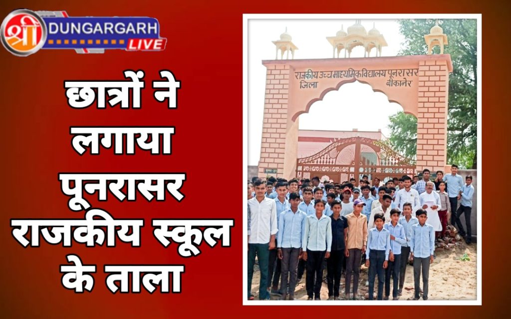 श्रीडूंगरगढ़ लाइव 18 जुलाई 2023। क्षेत्र के पूनरासर गांव में आज अजब स्थिति हो गयी जब राजकीय उच्च माध्यमिक विद्यालय के छात्र-छात्राओं ने अपने ही विद्यालय के तालाबंदी कर दी और प्रशासन के खिलाफ नारेबाजी करनी शुरू कर दी।
