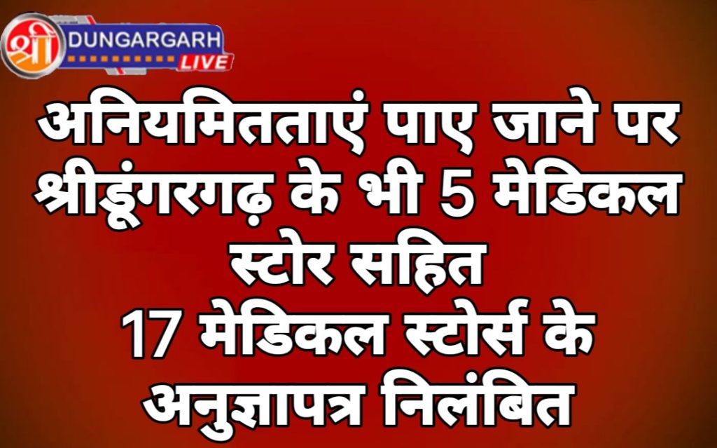 श्रीडूंगरगढ़ लाइव 21 जुलाई 2023। जांच के दौरान विभिन्न अनियमितताएं पाए जाने पर 17 मेडिकल स्टोर्स के अनुज्ञापत्र निलम्बित किए गए हैं।