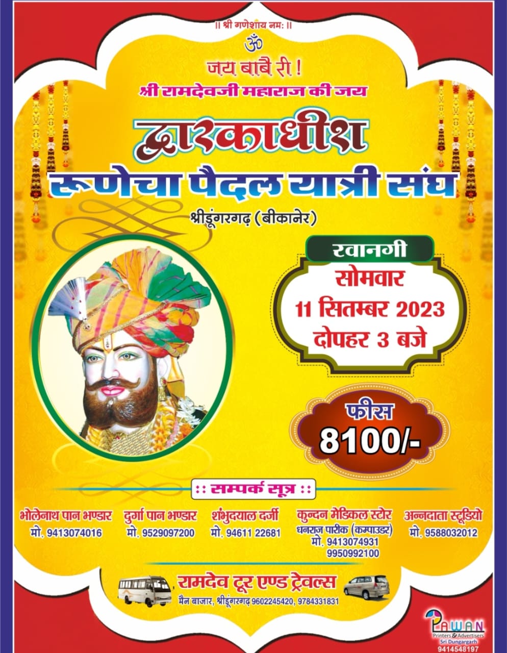 श्रीडूंगरगढ़ लाइव 22 जुलाई 2023। जैसे जैसे भादवा का महीना नजदीक आ रहा है वैसे वैसे मंदिर देवरो पे रौनक बढ़ने लग जाती है। कस्बे के द्वारकाधीश रुणेचा पैदल यात्री संघ की बैठक सम्पन्न हुई जिसमें 11 सितंबर 2023 सोमवार को दोपहर 3 बजे कालुबास रामदेवजी मंदिर से रवाना होगी। संघ के अध्यक्ष लालचंद मल्ल ने बताया कि जो भी भक्त पैदल जाने के इच्छुक है वे सभी कस्बे के भोलेनाथ पान भंडार, दुर्गा पान भंडार, शंभुदयाल दर्जी, कुंदन मेडिकल स्टोर और अन्नदाता स्टूडियो में संपर्क कर सकता है।