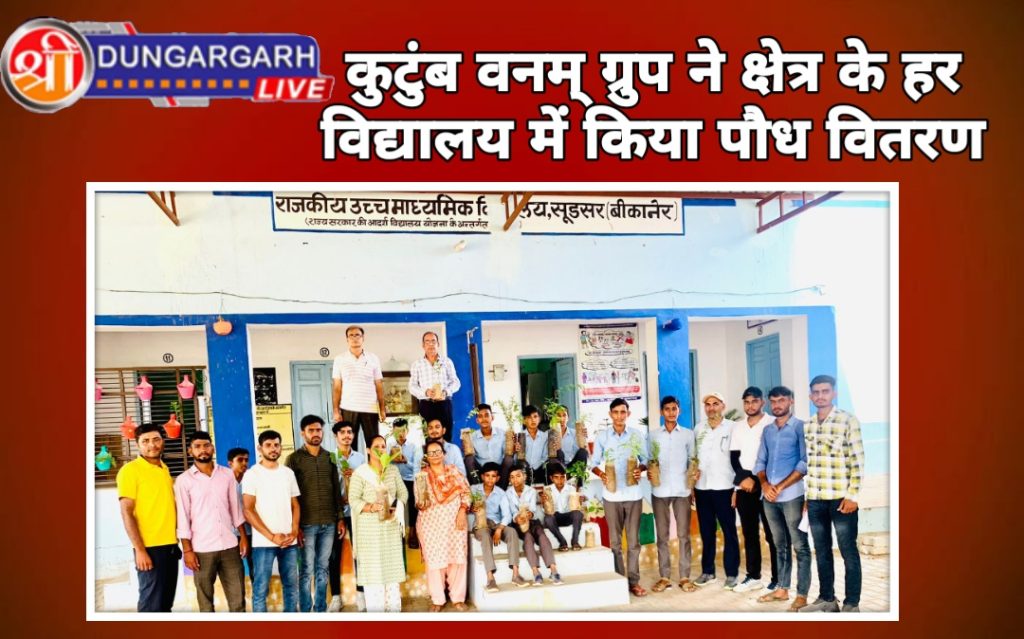 श्रीडूंगरगढ़ लाइव 24 जुलाई 2023। कुटुंब वनम ग्रुप सूडसर ने पर्यावरण संरक्षण के संकल्प के साथ क्षेत्र के हर विद्यालय में पौधा वितरण किया और छात्रों को पर्यावरण को बचाने के लिये सामुहिक प्रयास करने का प्रण दिलाया।