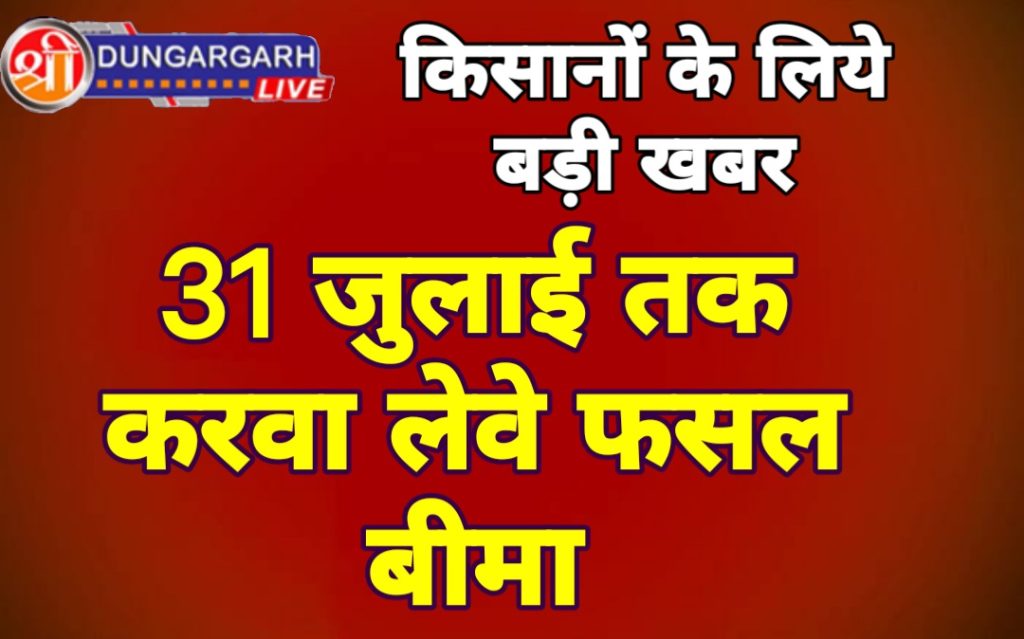 श्रीडूंगरगढ़ लाइव 24 जुलाई 2023।प्रधानमंत्री फसल बीमा योजना के तहत किसान 31 जुलाई तक खरीफ फसलों का बीमा करवा सकते हैं। राज्य सरकार द्वारा खरीफ 2023 के लिए फसल बीमा की अधिसूचना जारी कर दी गई है। संयुक्त निदेशक कृषि (विस्तार) कैलाश चौधरी ने बताया कि जिले के लिए एग्रीकल्चर इंश्योरेंस कंपनी अधिसूचित कर दी गई है। किसान ग्वार, मोठ, मूंग, तिल, कपास, मूंगफली एवं बाजरा जैसी फसलों का बीमा बैंक या सीएससी के माध्यम से करवा सकते हैं। जो किसान पिछले वर्ष बीमित फसलों में परिवर्तन करवाना चाहते हैं, वे 29 जुलाई तक बैंक में लिखित रूप में दे सकते हैं। उन्होंने बताया कि फसल बीमा योजना का लाभ ऋणी, गैर ऋणी एवं बटाईदार किसान भी ले सकेंगे।