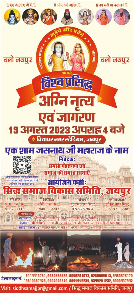 यह आयोजन जयपुर के विद्याधर नगर स्टेडियम में होने वाला है और इस भव्य आयोजन में लगभग 15-20000 हजार जसनाथ जी भक्तगण पधारेंगे।