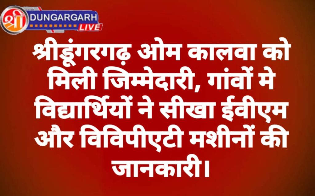 राजस्थान निर्वाचन आयोग और जिला निर्वाचन अधिकारी बीकानेर के निर्देशानुसार निर्वाचक रजिस्ट्रीकरण पदाधिकारी एवं उपखण्ड अधिकारी श्रीडूंगरगढ़ कार्यालय के निर्देशानुसार आज श्रीडूंगरगढ़ क्षेत्र के ग्राम पंचायतों बिग्गा, बिग्गाबास रामसरा, कितासर भाटियान और कितासर बीदावतान के राउमावि में मतदाता जागरूकता अभियान एमडीवि के तहत स्कूल स्टूडेंट्स के सम्मुख ईवीएम और वीवीपीएटी मशीनों का डेमोंस्ट्रेशन कार्यक्रम रखा गया जिसमें निर्वाचन शाखा श्रीडूंगरगढ़ से नौरत मल शर्मा एलमटी प्रदीप कौशिक एलमटी , किशोरीलाल आदि दक्ष प्रशिक्षकों द्वारा ईवीएम मशीन वीवीपीएटी मशीन का डेमोंस्ट्रेशन किया गया। नौरत मल शर्मा ने बच्चों को निर्वाचन मतदान प्रक्रिया और ईवीएम से मतदान के बारे में बताया।प्रदीप कौशिक एलमटी ने ईवीएम और वीवीपीएटी मशीनों से डेमोंस्ट्रेशन करके बच्चों को जागरूक किया।सभी स्कूल विद्यार्थियों ने रुचि और उत्साह के साथ कार्यक्रम में भागीदारी निभाई।शहीद कैप्टन चन्द्र चौधरी राउमावि बिग्गाबास रामसरा में आयोजित कार्यक्रम में प्रधानाचार्य ओम प्रकाश शर्मा ने निर्वाचन विभाग की इस पहल का अधिकाधिक लाभ लेने का आह्वान किया।