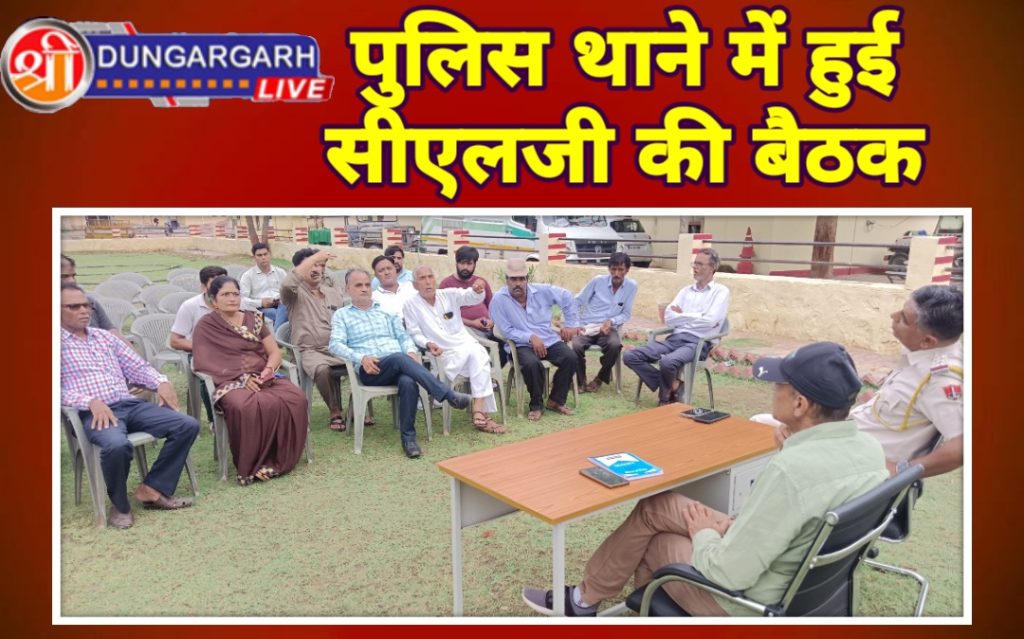 श्रीडूंगरगढ़ लाइव 25 जुलाई 2023। श्रीडूंगरगढ़ पुलिस थाना में वृताधिकारी रामेश्वर लाल सहारण की अध्यक्षता में सीएलजी की मीटिंग हुई। इस बैठक में शहर के गणमान्य नागरिकों पार्षद सोहनलाल ओझा, राधेश्याम सारस्वत, हरी जोशी, सलीम बहेलिया, आशा पारीक ने हिस्सा लिया। मीटिंग में श्रीडूंगरगढ़ थानाधिकारी अशोक बिश्नोई ने मोहर्रम के त्यौहार को शान्ति और सद्भावनापूर्वक मनाने और आपसी भाईचारा बनाये रखने की बात कही।