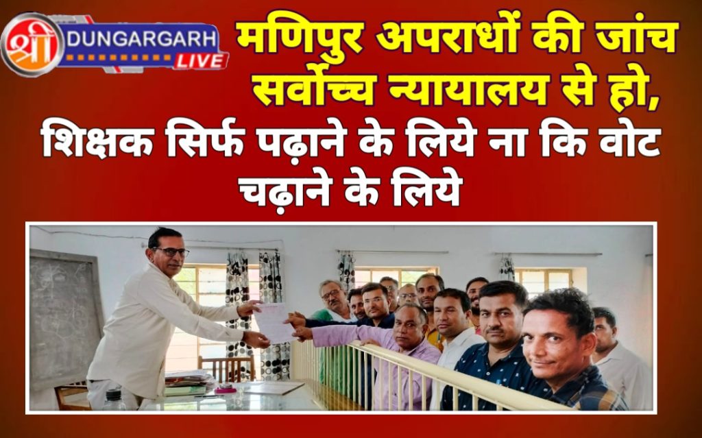 श्रीडूंगरगढ़ लाइव 26 जुलाई 2023। राजस्थान शिक्षक संघ (शेखावत) ने कल मंगलवार को उपखण्ड कार्यालय में तहसीलदार राजवीर कड़वासरा को भारत के राष्ट्रपति के नाम ज्ञापन देते हुए बताया कि शिक्षक संघ ने सभी कर्मचारी संगठन की अगुवाई करते हुए भारत के पूर्वी प्रान्त मणिपुर में जारी हिंसा और महिलाओं के प्रति हो रहे जघन्य अपराधों की जांच सर्वोच्च न्यायालय की कमेटी द्वारा हो और राज्य की सरकार को बर्खास्त किया जाए। संघ के शिक्षक नेता सोहन गोदारा ने कहा कि सत्ता में जब जब धृतराष्ट्र काबिज होंगे, तब तब द्रोपदी का चीरहरण होता रहेगा। सम्पूर्ण देश मे ही आये दिन महिलाओं पर अत्याचार की खबरे सुर्खियों में रहती है और महिलाओं को सुरक्षा के नाम पर कुछ भी हासिल नही है। अपनी इज्जत बचाने के लिए जंतर मंतर पर बेठी बेटीयों को घसीटा जा रहा है। जयनारायण व्यास विश्वविद्यालय सरीखे शिक्षा मंदिरों में दिन दहाड़े बेटी को दरिंदो द्वारा नोचा जा रहा है।सरकार आंख बंद किये बैठी है।