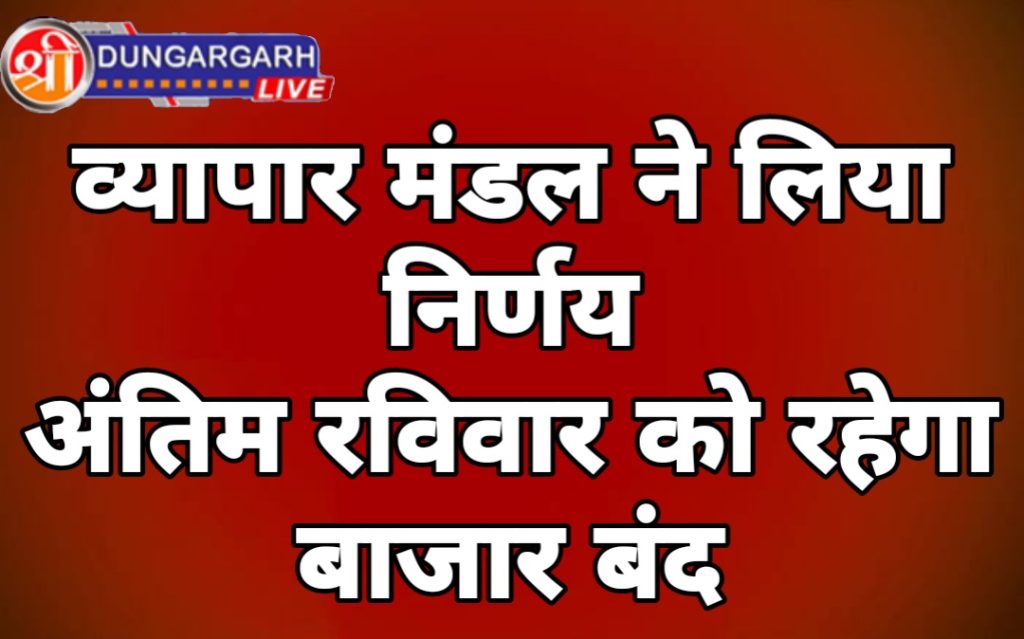 श्रीडूंगरगढ़ लाइव 28 जुलाई 2023। व्यापार मंडल के अध्यक्ष श्यामसुंदर पारीक और महामंत्री संजय करनाणी ने बताया कि व्यापार मंडल द्वारा माह के अंतिम रविवार को बंद रखने का निर्णय किया गया है, अतः सभी व्यापारी अपना व्यापारिक प्रतिष्ठान महीने के अंतिम रविवार को बंद रखे। संगठन के विरुद्ध अपना प्रतिष्ठान खुले रखने वालों के खिलाफ सांगठनिक कार्यवाही की जाएगी। संगठन द्वारा भविष्य में किसी ही प्रकार का सहयोग नही किया जाएगा।