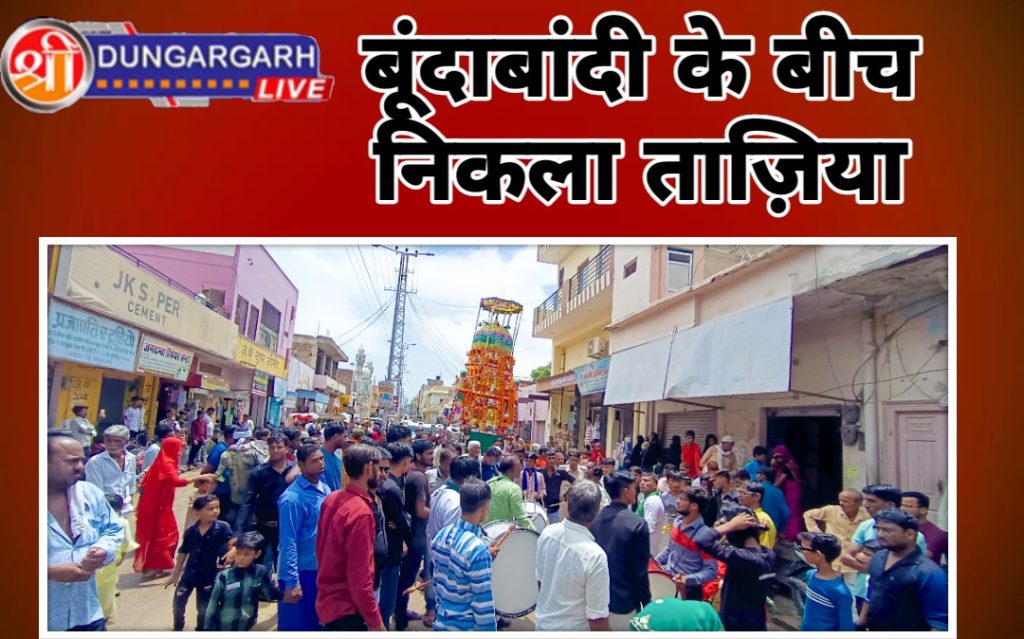 आज शनिवार को जब ताजिये मस्जिद से रवाना हुए तब बरसात ने खलल डाला। रिमझिम बरसात के बीच ताजिया बाजार के मुख्य मार्गो से निकला। सड़क पर बरसाती पानी इकट्ठा हो रखा था। पुलिस प्रशासन चाक चौबंद रहा। श्रीडूंगरगढ़ थानाधिकारी अशोक बिश्नोई के नेतृत्व में पुलिस कस्बे के मुख्य बाजार में तैनात रही। मुस्लिम समाज ने ताजिये से आगे तिरंगा लगाकर देशप्रेम का संदेश दिया।