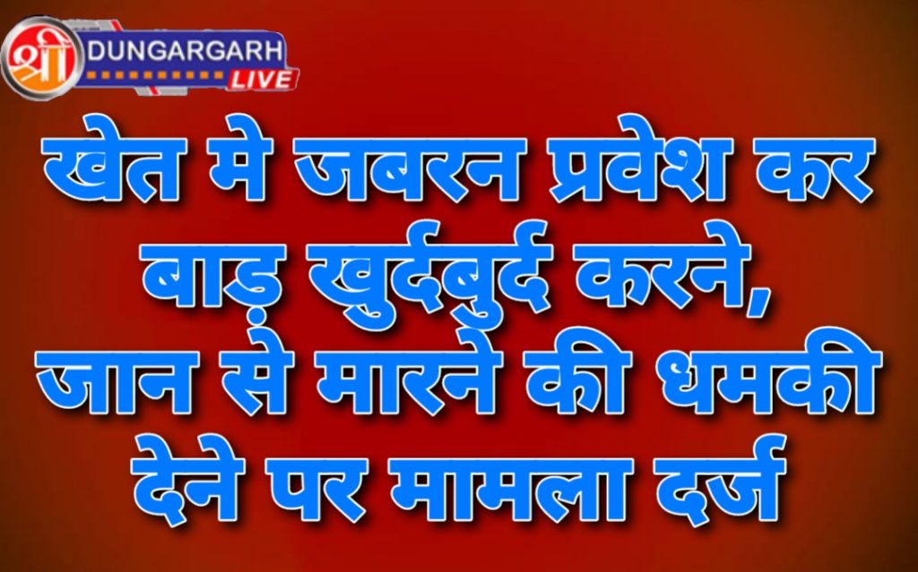 श्रीडूंगरगढ़ लाइव 30 जुलाई 2023। मोमासर बास श्रीडूंगरगढ़ निवासी नितेश पुत्र ओमप्रकाश मोदी ने पुलिस थाना श्रीडूंगरगढ़ में मुकद्दमा दर्ज करवाया कि श्रीडूंगरगढ़ रोही में उसका एक 2.10 हेक्टेयर का खेत है। जिस पर कोलकाता हाई कोर्ट का स्टे है। जब 28 जुलाई को सुबह मैं अपने खेत पर गया तो देखा कि राजू पुत्र मदनलाल प्रजापत, दमयंती सिखवाल, भगवानाराम पुत्र कालूराम मेघवाल सहित 7-8 अन्य लोग मेरे खेत मे अनाधिकृत रूप से ट्रेक्टर लेकर प्रवेश किया हुआ था और खेत की बाड़, खींप और फोग को खुर्दबुर्द कर दिया था। मेरे मना करने पर मुझे जान से मारने की धमकी दी। पुलिस ने मुकद्दमा दर्ज कर जांच शुरू कर दी है।
