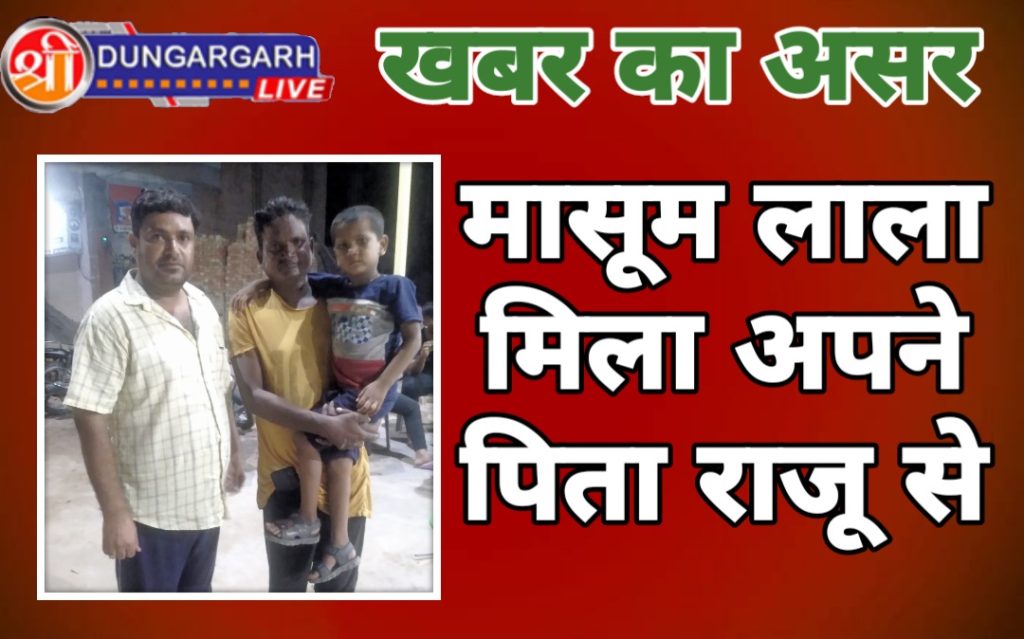 श्रीडूंगरगढ़ लाइव न्यूज़ 30 जुलाई 2023। शाम को आशीष पेट्रोल पंप के पास मासूम लाला सामाजिक कार्यकर्ता नितिन नाई को रोता हुआ मिला। जिसपर नितिन नाई ने श्रीडूंगरगढ़ लाइव को इसके बारे में जानकारी दी। श्रीडूंगरगढ़ लाइव पर खबर प्रसारित होने के बाद शाम देर शाम को मासूम लाला के पिताजी राजू वहां पहुंचे और अपने बेटे को लेने पहुंच गये। उन्होंने बताया कि वे लाडनूं के निवासी है। लाला अपनी भुआ और फूफा बबलू बिसायती के घर मोमासर बास श्रीडूंगरगढ़ आया हुआ है। परिवार वालों ने सामाजिक कार्यकर्ता नितिन नाई और श्रीडूंगरगढ़ लाइव को धन्यवाद दिया।