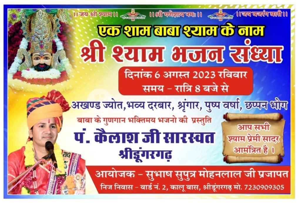 श्रीडूंगरगढ़ लाइव 06 अगस्त 2023। एक शाम श्याम धनी के नाम… श्रीडूंगरगढ़ के वार्ड नंबर 2 कालू बास के निवासी मोहनलाल सुभाष कुमार प्रजापत द्वारा खाटू श्याम जी महाराज का भव्य जागरण आज शाम 8:30 निज निवास में होगा। खाटू श्याम के भजनों की प्रस्तुति लोकप्रिय कलाकार और कथावाचक पंडित कैलाश सारस्वत देंगे। भजन संध्या में बाबा की अखंड ज्योत और श्रृंगार सहित भव्य दरबार लगाया जाएगा। बाबा खाटू नरेश के छप्पन भोग लगाया जायेगा और भक्तों पर पुष्प वर्षा की जाएगी।स्थानीय कलाकारों द्वारा भी सी जायेगी प्रस्तुति।
