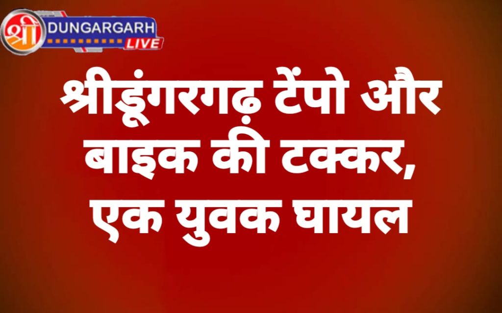 श्रीडूंगरगढ़ के नेशनल हाईवे 11 बीकानेर की तरफ पुलिया के ऊपर टेंपो और बाइक की टक्कर हुई है। इस टक्कर में बाइक पर सवार एक युवक गंभीर घायल हुआ है। सूचना पर आपणों गांव श्री डूंगरगढ़ सेवा समिति की क्विक एंबुलेंस मौके पर पहुंची और घायल युवक को सामुदायिक उप जिला अस्पताल लेकर आई है। डॉक्टरों ने युवक का प्राथमिक उपचार किया है। युवक का एक पर टूट गया है व सिर में चोट आई है। खबर की सूचना पर हॉस्पिटल के अंदर बड़ी संख्या में युवाओं की भीड़ एकत्र हो गई। युवक को फिलहाल प्राथमिक उपचार के बाद बीकानेर रैफर कर दिया है। घायल युवक की पहचान ओमप्रकाश पुत्र मघाराम बाना गांव के बताये जा रहे है