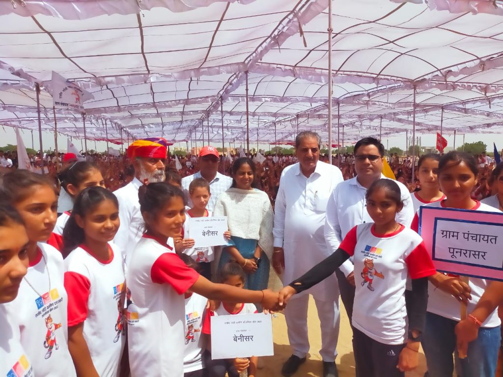 राजीव गांधी ग्रामीण ओलंपिक खेल 2023 की श्रीडूंगरगढ़ की ब्लॉक स्तरीय खेलकूद प्रतियोगिता का आज भव्य उद्घाटन समारोह आयोजित हुआ और विधिवत रूप से प्रतियोगिता का शुभारंभ हुआ जिसकी अध्यक्षता स्थानीय विधायक श्री गिरधारी लाल महिया ने की। श्री मंगलाराम गोदारा पूर्व विधायक मुख्य अतिथि के रूप में मंचस्थ रहे।श्रीमती नित्या के. सी. ई.ओ. जिला परिषद और श्रीमती सावित्री देवी गोदारा प्रधान पंचायत समिति श्रीडूंगरगढ़ विशिष्ट अतिथि रहे।मंचस्थ अतिथियों ने माँ शारदे के सम्मुख दीप प्रज्वलित कर कार्यक्रम का शुभारम्भ किया।राउमावि तोलियासर, राबाउमावि श्रीडूंगरगढ़ और जे पी एस स्कूल के विद्यार्थियों द्वारा सांस्कृतिक कार्यक्रमों की प्रस्तुति दी गई।श्री गिरधारीलाल महिया स्थानीय विधायक ने खेलों का महत्त्व बताते हुए माननीय मुख्यमंत्री महोदय का आभार जताया।श्री मंगलाराम गोदारा पूर्व विद्यायक ने खिलाड़ियों को प्रेरित करते हुए बताया कि सम्मानीय श्री अशोक गहलोत मुख्यमंत्री राजस्थान द्वारा राजीव गांधी ग्रामीण ओलम्पिक खेलों का आयोजन करवाकर ग्रामीण क्षेत्र की प्रतिभाओं को तराशने का कार्य किया जा रहा है।साथ ही श्री मंगलाराम गोदारा ने प्रधान पं स से यह माँग रखी कि प्रत्येक ग्राम पंचायत में खेलकूद हेतु 20000/-रुपये बजट जारी किया जाए और विजेता टीमों को नगद पुरस्कार देकर सम्मानित किया जाए।नित्या के सी ई ओ जिला परिषद ने शानदार आयोजन के लिए पंचायत समिति श्रीडूंगरगढ़ और शिक्षा विभाग का आभार जताया।मुकेश कुमार चौधरी उपखण्ड अधिकारी श्रीडूंगरगढ़ ने खिलाड़ियों को खेलों और निर्वाचन की शपथ दिलवाई। सभी अतिथियों ने ध्वजारोहण कर खेलों का शुभारंभ किया। मुख्य ब्लॉक शिक्षा अधिकारी श्रीडूंगरगढ़ श्री ओम प्रकाश प्रजापत ने बताया कि श्रीडूंगरगढ़ ब्लॉक से महिला वर्ग में कबड्डी, टैनिस बॉल क्रिकेट, खो-खो,वॉलीबॉल, फुटबॉल और रस्सा कस्सी सहित कुल 06 खेलों में 176 टीमों में कुल 1852 महिला खिलाड़ी और पुरूष वर्ग में कबड्डी, शूटिंग वॉलीबॉल, टैनिस बॉल क्रिकेट, वॉलीबॉल और फुटबॉल सहित कुल 05 खेल स्पर्धाओं में 206 टीमों के कुल 2324 खिलाड़ी भाग लेंगे।मोमासर सरपंच जुगराज संचेती के सौजन्य से सभी विजेता टीमों और खिलाड़ियों को ट्रॉफी वितरित की जाएगी