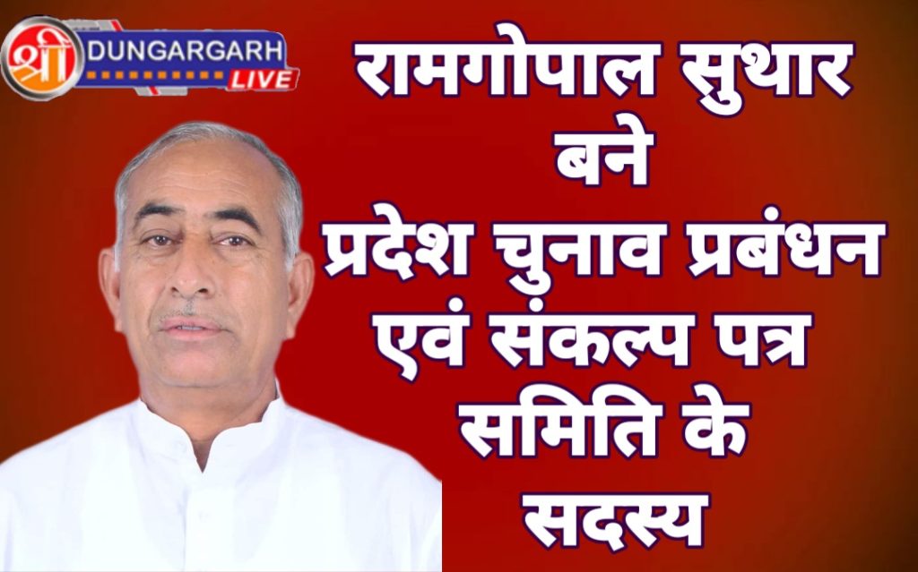 श्रीडूंगरगढ़ लाइव 17 अगस्त 2023। राजस्थान विधानसभा के चुनाव में अब कुछ ही महीने शेष है। राज्य के दोनों ही बड़े राजनीतिक दल चुनावी मोड में आ चुके है। चुनावी रणनीति तैयार की जा रही है। क्षेत्रीय क्षत्रपों को जिम्मेदारियां दी जा रही है। बीकानेर के सांसद अर्जुनराम मेघवाल को राजस्थान भाजपा में बड़ी जिम्मेदारी दी गई है। उन्हें प्रदेश चुनाव प्रबंधन और संकल्प पत्र समिति का अध्यक्ष बनाया गया है। श्रीडूंगरगढ़ विधानसभा के कद्दावर भाजपा नेता और पूर्व देहात जिलाध्यक्ष व पूर्व उपप्रधान रामगोपाल सुथार को इसी संकल्प समिति का सदस्य बनाया गया है। समिति का सदस्य बनाये जाने पर सुथार के प्रशंसकों न एक दूसरे को बधाईयां दी है। नवरतन राजपुरोहित, गोपाल शास्त्री व्यास, शिवप्रसाद तावणियाँ एवं अन्य समर्थकों ने पूर्व जिलाध्यक्ष की नियुक्ति पर उन्हें बधाई दी।