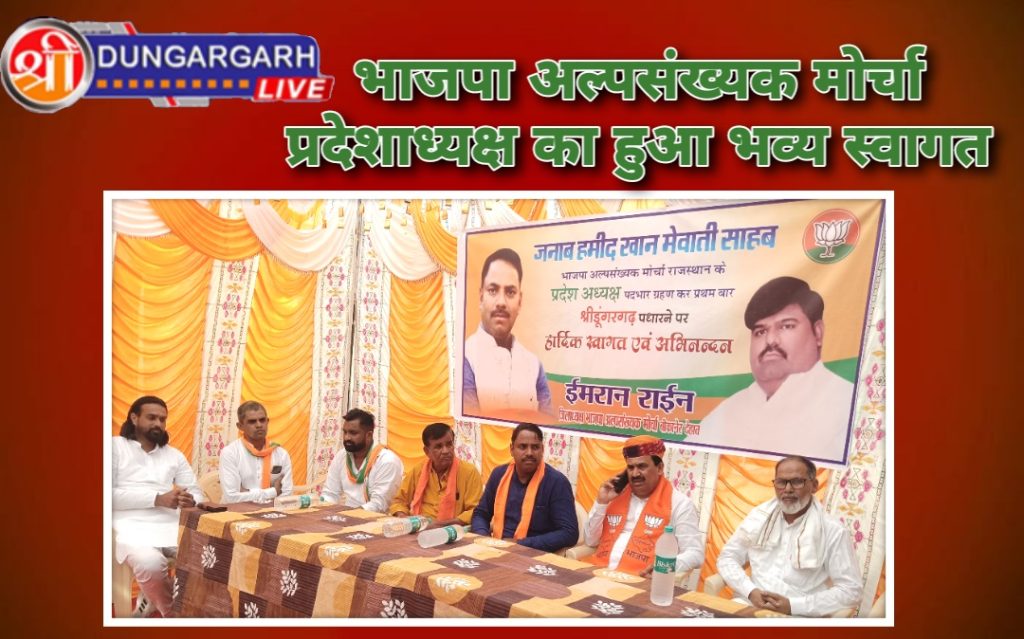 श्रीडूंगरगढ़ लाइव 18 अगस्त 2023। भारतीय जनता पार्टी अल्पसंख्यक मोर्चा के प्रदेशाध्यक्ष हमीद खान मेवाती का प्रदेशाध्यक्ष बनने के बाद प्रथम बार श्रीडूंगरगढ़ आगमन पर भाजपा अल्पसंख्यक मोर्चा के बीकानेर जिलाध्यक्ष इमरान राईन के नेतृत्व में भाजपा कार्यकर्ताओं और पार्षदों ने स्वागत किया।