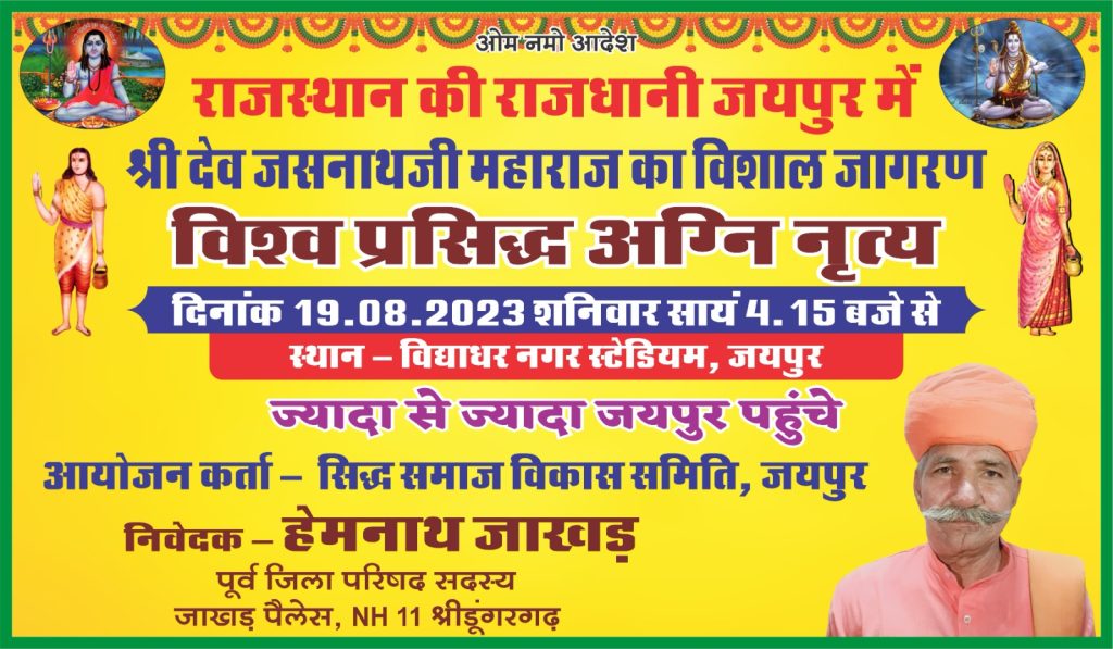 श्रीडूंगरगढ़ लाइव न्युज 19 अगस्त 2023। श्री देव जसनाथ जी महाराज का विशाल जागरण आज जयपुर के विद्याधर नगर स्टेडियम में आयोजित होगा। पूरे भारत से आज विद्याधर नगर स्टेडियम में लाखो की संख्या में भगवा पगड़ी पहन कर जसनाथ संप्रदाय के लोग एकत्रित होंगे। इसको लेकर पूरे राजस्थान से जसनाथी सिद्ध संप्रदाय के लोग जयपुर पहुंचने शुरू हो गए हैं। पूर्व जिला परिषद सदस्य हेमनाथ जाखड़ ने बताया कि आज शनिवार को विद्याधर नगर स्टेडियम जयपुर में विशाल जागरण होगा और विश्व प्रसिद्ध अग्नि नृत्य किया जाएगा। नारायण नाथ बेनीसर ने बताया कि श्रीडूंगरगढ़ से जयपुर सैंकड़ों बसों द्वारा गुरु जसनाथ जी महाराज का अग्नि नृत्य देखने लिए हजारों भक्त रवाना हुए। इस आयोजन में भाग लेने के लिए श्रीडूंगरगढ़ से चार बसें व 10 छोटे वाहन रवाना गए हैं। सभी गांवों से सुबह 8 बजे जसनाथ जी महाराज के जयकारे के साथ बसें रवाना हुई है।