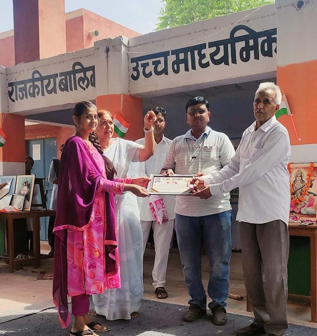 राजकीय बालिका उच्च माध्यमिक विद्यालय दुलचासर में शनिवार को आयोजित कार्यक्रम में 10वीं-12वीं बोर्ड में 80% से ऊपर अंक लाने वाले विद्यार्थियों को सम्मानित किया गया। इस मौके पर समाजसेवी राजाराम सुथार ने कहा कि विद्यार्थियों को सफलता हासिल करने के लिए खूब मेहनत करनी चाहिए। प्रतिभाशाली विद्यार्थियों को सार्वजनिक मंच पर सम्मानित करने से दूसरे विद्यार्थियों को भी आगे बढ़ने की प्रेरणा मिलती है। समाजसेवी अशोक सुथार ने 12 वीं बोर्ड परीक्षा में गायत्री बुड़िया (88%), हर्षिता शर्मा (86.60%),प्रीती सैन (84.40%), शिवानी (83.80%),राधा सुथार (83.20%),रेवंती (82%), एवं दसवीं बोर्ड में विमला को 81.83% अंक प्राप्त करने पर स्मृति चिन्ह एवं चांदी का सिक्का भेंट कर सम्मानित किया गया। राजकीय उच्च माध्यमिक विद्यालय दुलचासर के विधार्थी ब्रह्मानंद शर्मा,कुणाल सिंह एवं दसवीं बोर्ड के दिनेश गोयल को भी स्मृति चिन्ह के साथ चांदी का सिक्का भेंट कर सम्मानित किया गया। शाला की प्रधानाचार्या श्रीमती सावित्री पूनियां ने आगंतुकों का आभार जताया।