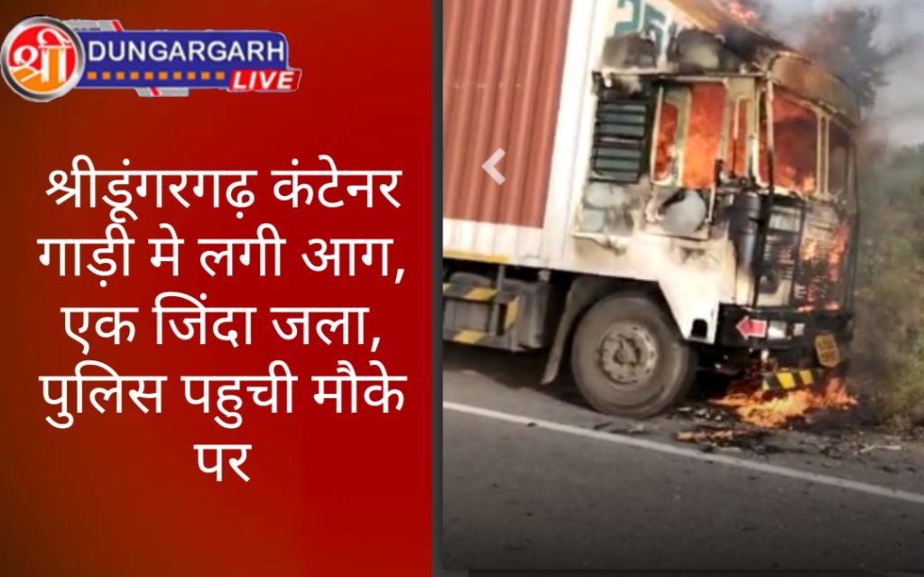श्रीडूंगरगढ़ नेशनल हाईवे 11 पर कितासर गांव के पास एक कंटेनर गाड़ी में आग लगने की सूचना सामने आई है।पुलिस को सूचना मिलने पर पुलिस के एएसआई रविंदर सिंह , हेड कांस्टेबल हवा सिंह की टीम भी मौके पर पहुंच चुकी है। ट्रक के अंदर एक व्यक्ति की जली हुई बॉडी मिली है फिलहाल पुलिस मामले की जांच में जुट चुकी है घटना की जानकारी मिलने पर नगरपालिका की फायर फाइटर मौके पर पहुंची और आग पर काबू पाया गया।