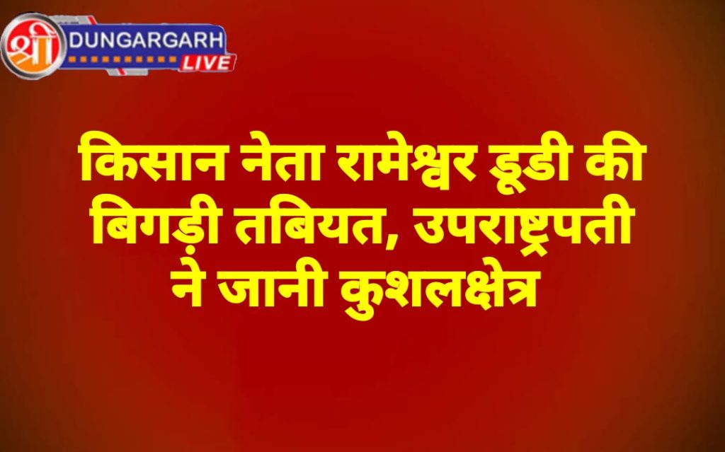 किसान नेता रामेश्वर डूडी को जयपुर के एसएमएस हॉस्पिटल के बांगड़ विभाग में एडमिट करवाया गया है। सुबह से ही कांग्रेस और प्रदेश के नेता उनकी कुशलक्षेम जानने पहुंच रहे है। अभी अभी उपराष्ट्रपति जगदीप धनखड़ एसएमएस पहुंचे है। कॉमरेड बजरंग दुसाद ने बताया कि उपराष्ट्रपति धनखड़ ने डॉक्टर्स से मिलकर उनकी हेल्थ अपडेट ली है। एसएमएस हॉस्पिटल के बाहर डूडी के प्रशंसकों की भीड़ जमा हो गयी है। सभी अपने नेता की कुशलता की प्रार्थना कर रहे है।श्रीडूंगरगढ़ से यूथ कांग्रेस के विधानसभा अध्यक्ष संतोष गोदारा, दिनेश पिलानिया, जगराम बाना, ओमप्रकाश जाखड़ भी जयपुर पहुंच गए है। वहीं अशोक बुड़ीया, सुरेन्द्र जाखड़, ओमप्रकाश गोदारा, सुनील धारनिया भी बीकानेर से जयपुर पहुंचने वाले है। बता देवें कांग्रेस देहात जिलाध्यक्ष बिशनाराम सिहाग व युवा नेता हरिराम बाना सुबह ही रवाना होकर जयपुर पहुंच गए है। किसान नेता पूनमचंद नैण भी सुबह से जयपुर ही है और नैण पहले मंगलम हॉस्पिटल और बाद में एसएमएस पहुंचे। इनके अतिरिक्त भी बड़ी संख्या में डूडी समर्थक अस्पताल के बाहर पहुंच गए है। सोशल मीडिया पर भी चारों ओर डूडी के स्वास्थ्य की कामना की जा रही