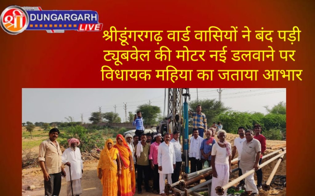 श्रीडूंगरगढ़ प्रताप बस्ती वार्ड नं. 15, 16 में पिछले 10 दिनो से जलदाय विभाग का टूबवेल मोटर जल जाने के कारण बन्द पड़ा हुआ था। वार्ड में पानी की समस्या गत 10 दिनो से बनी हुई थी इस समस्या को लेकर सभी वार्ड के लोगों ने विधायक गिरधारी महिया को अवगत करवाया, विधायक ने तुरंत पानी की नई मोटर जलदाय विभाग को आदेश दिलवाकर लोरिग मशीन भेज कर दलवाई जिसे वार्ड वासियों को पानी की समस्या से निजात मिली और वार्ड वासियों ने विधायक का आभार व्यक्त किया इस मोके पर सामाजिक कार्यकर्ता आनंद मारु, भंवर लाल प्रजापत, रामचन्द्र गीला, नौरंग,महावीर देरासरी, परसाराम ,भंवर गोदारा, अक्तर काजी, आलमदीन चुनकर, गंगासागर, लूणजी जांगू,भगवान गोदारा, सीता देवी, शान्ति देवी, राधादेवी, राजू देवी सहित अनेक वार्ड के लोग उपस्थित रहे।