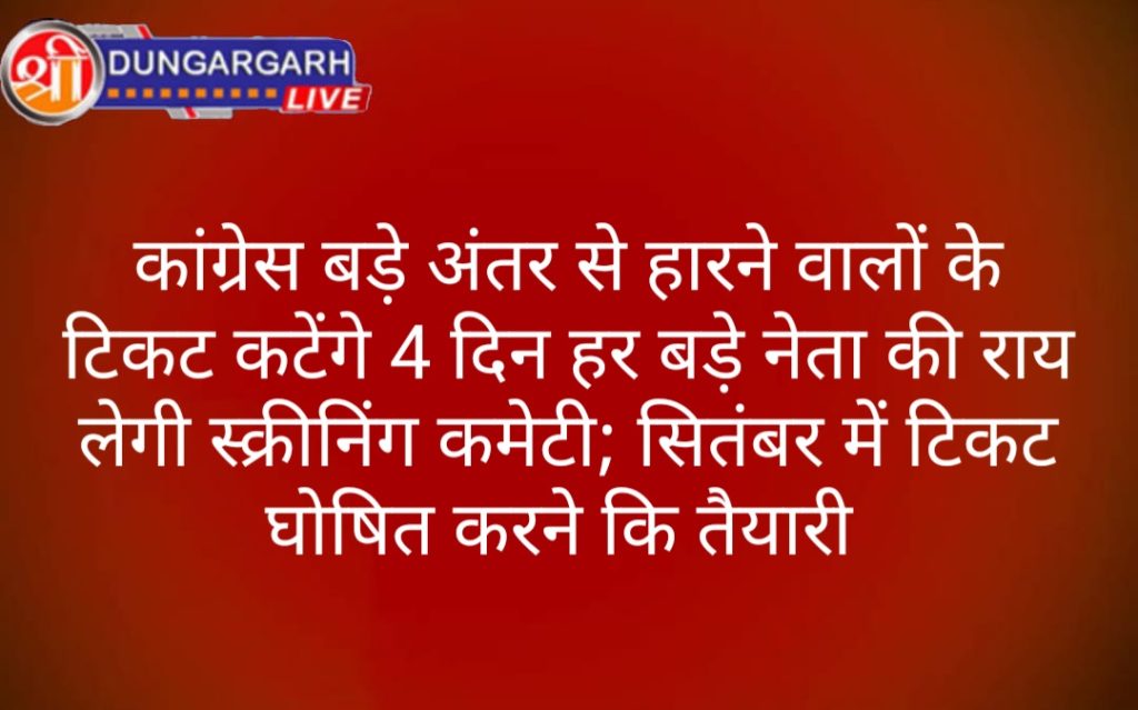 कांग्रेस सितंबर में टिकट घोषित करने की तैयारी कर रही है। प्रदेश चुनाव समिति के बाद अब स्क्रीनिंग कमेटी ने इसको लेकर काम शुरू कर दिया है। कांग्रेस स्क्रीनिंग कमेटी के अध्यक्ष और सदस्य अगले चार दिन तक लगातार बैठकें करके उम्मीदवार चयन पर फीडबैक लेंगे। इसकी शुरुआत सोमवार से हो गई है। कांग्रेस वॉर रूम में हुई स्क्रीनिंग कमेटी की बैठक और इसके बाद वन टू वन फीडबैक में वरिष्ठ नेताओं ने उम्मीदवार चयन के मापदंडों पर खुलकर सुझाव दिए। बैठक में यह सुझाव आया कि पिछली बार बड़े अंतर से हारने वाली सीटों पर इस बार उम्मीदवार बदले जाने चाहिए। नेताओं ने पूर्व सांसदों को भी विधानसभा चुनाव लड़ाने का सुझाव दिया है। बैठक में कई नेताओं ने कहा कि बीजेपी पूर्व सांसदों को चुनाव लड़ाने पर विचार कर रही है। कांग्रेस में भी कई पूर्व सांसदों का अच्छा जनाधार है। उन्हें विधानसभा चुनाव में टिकट दिया जाना चाहिए। इसका फायदा होगा।