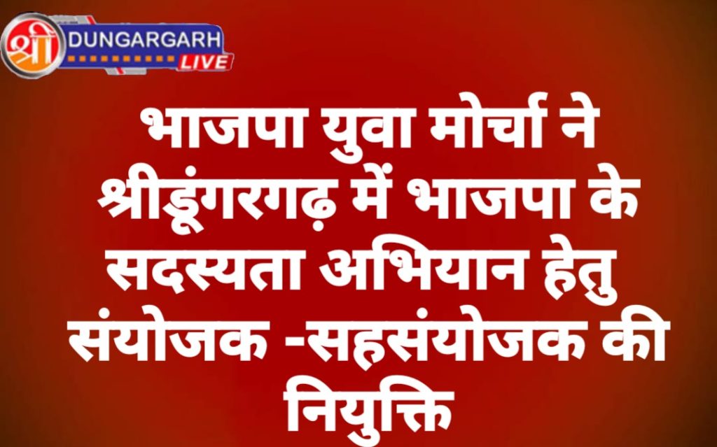 भारतीय जनता पार्टी प्रदेशाध्यक्ष सी.पी. जोशी एवं भाजयुमो प्रदेशाध्यक्ष अंकित गुर्जर चेची के निर्देशानुसार “सदस्यता अभियान-2023 के प्रदेश सह-संयोजक, संभाग प्रभारी विधानसभा संयोजक एवं सह संयोजकों की घोषणाये हुई भाजपा जिलाध्यक्ष जालम सिंह भाटी और युवा मोर्चा जिलाध्यक्ष जसराज सिंवर के नेतृत्व में श्रीडूंगरगढ़ विधानसभा क्षेत्र के दो युवाओ को पार्टी ने इन अभियानो की जिम्मेदारी सौंपी। क्षेत्र के युवा सुरेंद्र स्वामी को श्रीडूंगरगढ़ विधानसभा संयोजक और आईदान पारीक को सहसंयोजक बनाया गया। इस दौरान महावीर प्रजापत, महेश राजोतिया,भवानी प्रकाश तावणियाँ, सुरेन्द्र चुरा,भवानी सिंह बिका,गोपी मेघवाल, सांवरमल सारस्वत, अनिल वाल्मीकि, विष्णु वाल्मीकि, तिलोक मेघवाल आदि कार्यकर्ताओं ने दोनों की नियुक्ति पर शुभकामनाएं दी ।