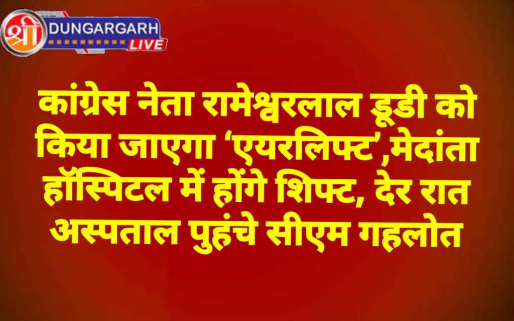 कांग्रेस नेता रामेश्वरलाल डूडी को बेहतर ट्रीटमेंट के लिए SMS से दिल्ली के मेदांता हॉस्पिटल में शिफ्ट किया जाएगा. डूडी का SMS अस्पताल के न्यूरो सर्जरी ICU में इलाज चल रहा है. पिछले करीब 36 घंटे से डूडी की हालत स्थिर बनी हुई है.
